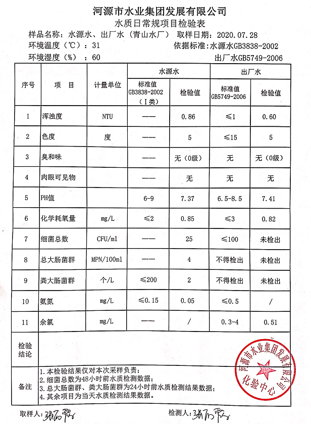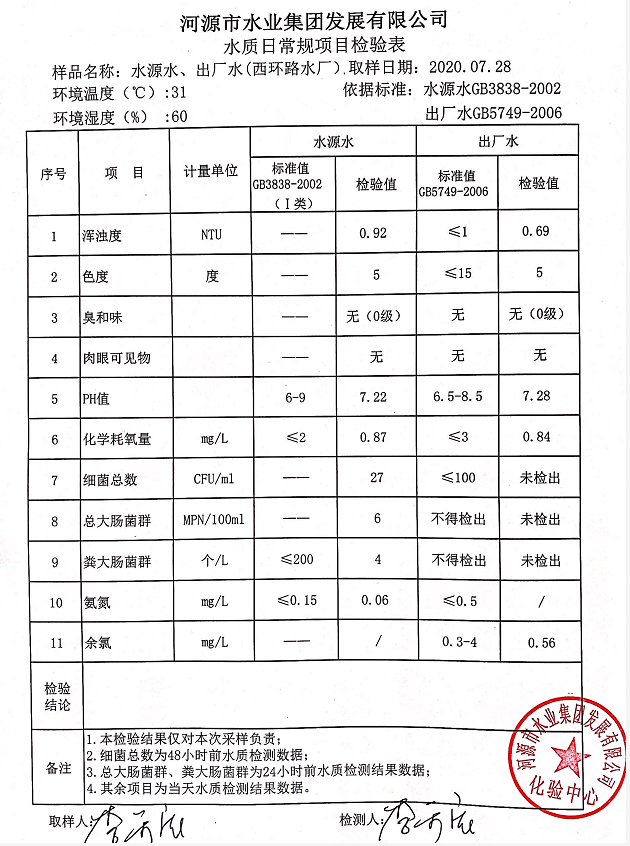 2020年7月28日水質(zhì)檢驗報告