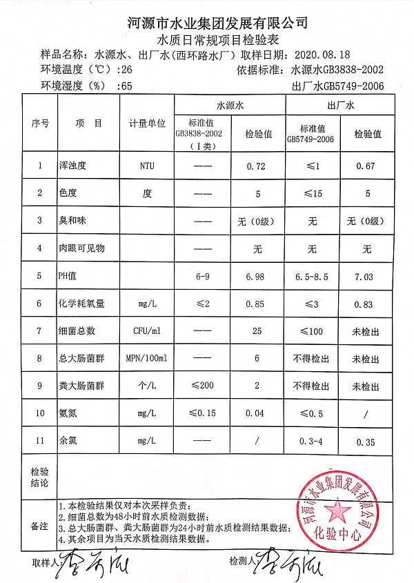 2020年8月18日水質(zhì)檢驗(yàn)報告