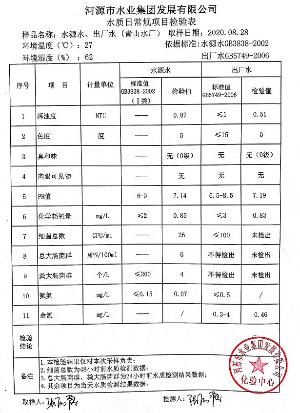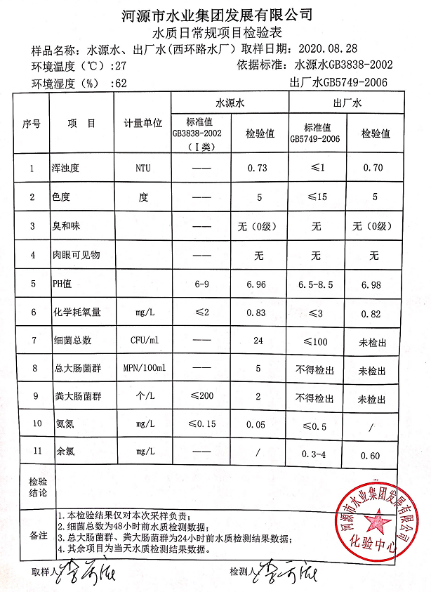2020年8月28日水質(zhì)檢驗報告