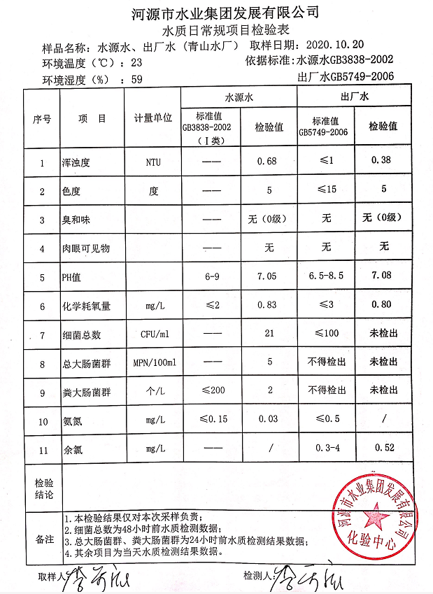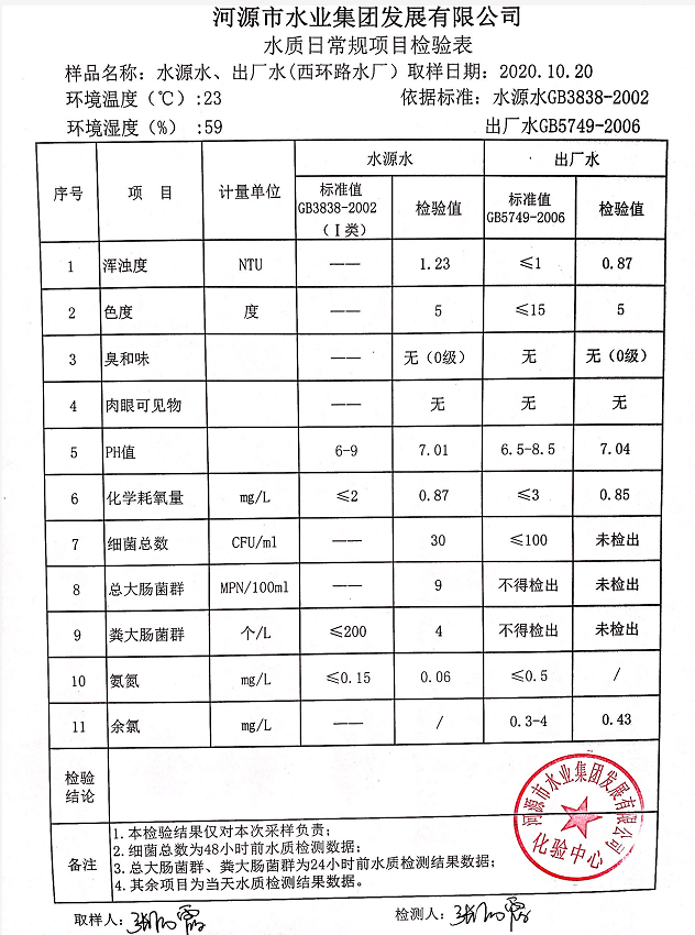 2020年10月20日水質(zhì)檢驗報告