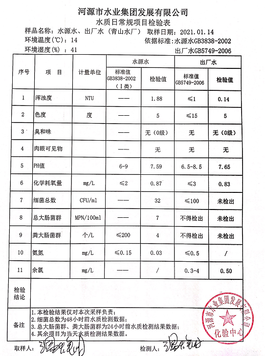 2021年1月14日水質(zhì)檢驗報告