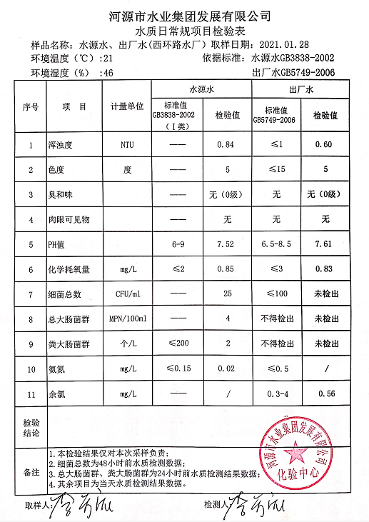 2021年1月28日水質(zhì)檢驗(yàn)報告