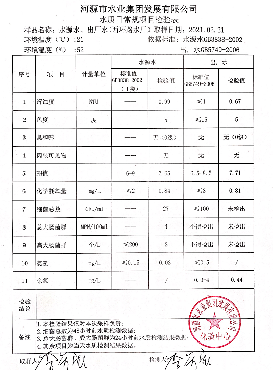 2021年2月21日水質(zhì)檢驗(yàn)報告