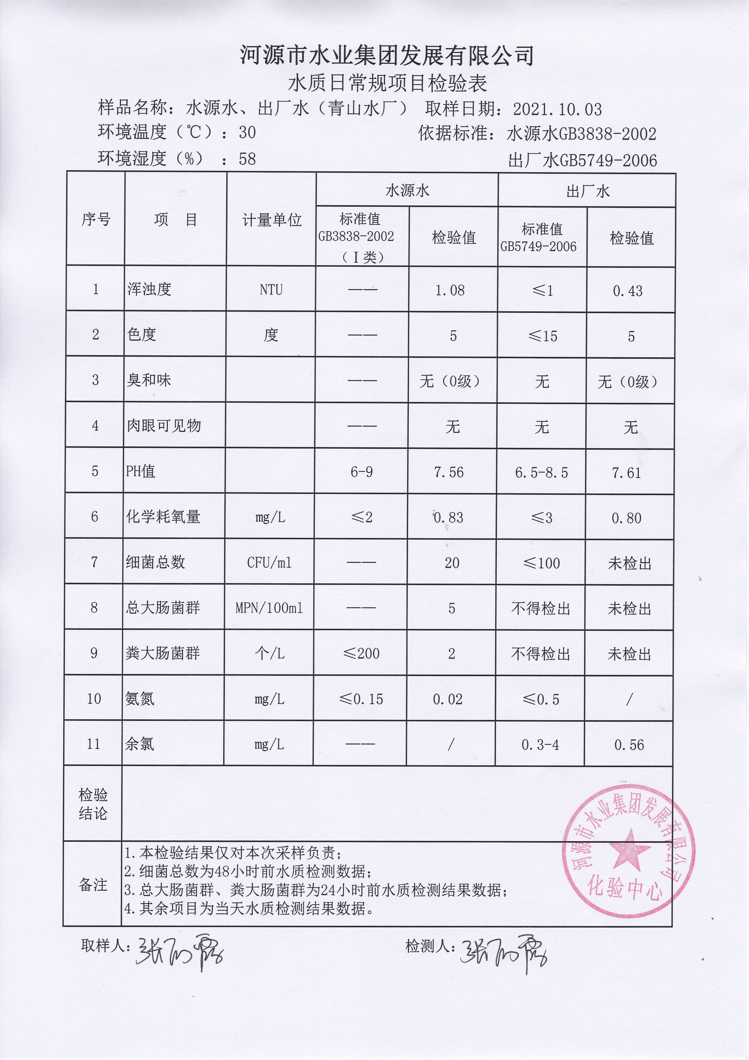 2021年10月3日水質(zhì)檢驗(yàn)報(bào)告