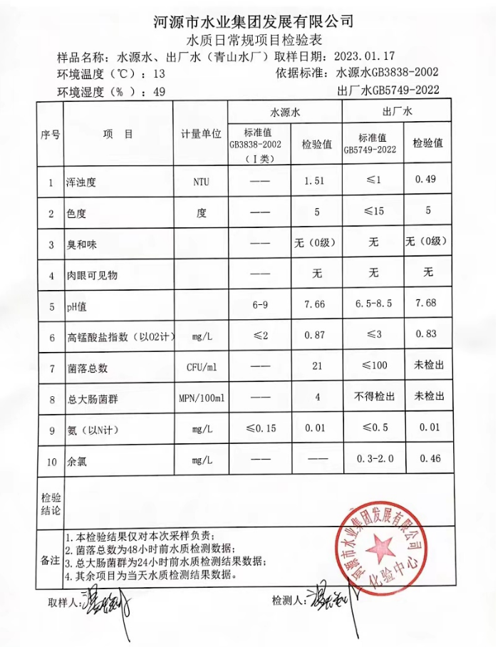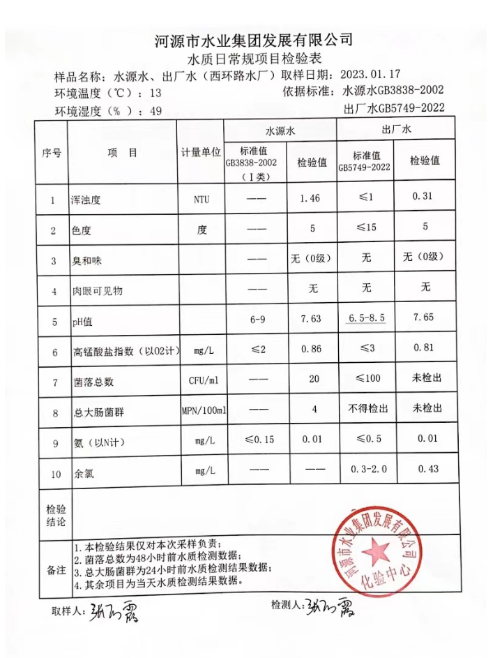 2023年1月17日水質(zhì)檢驗(yàn)報(bào)告