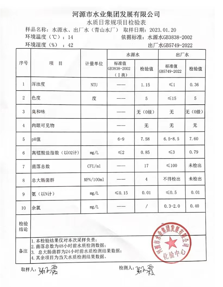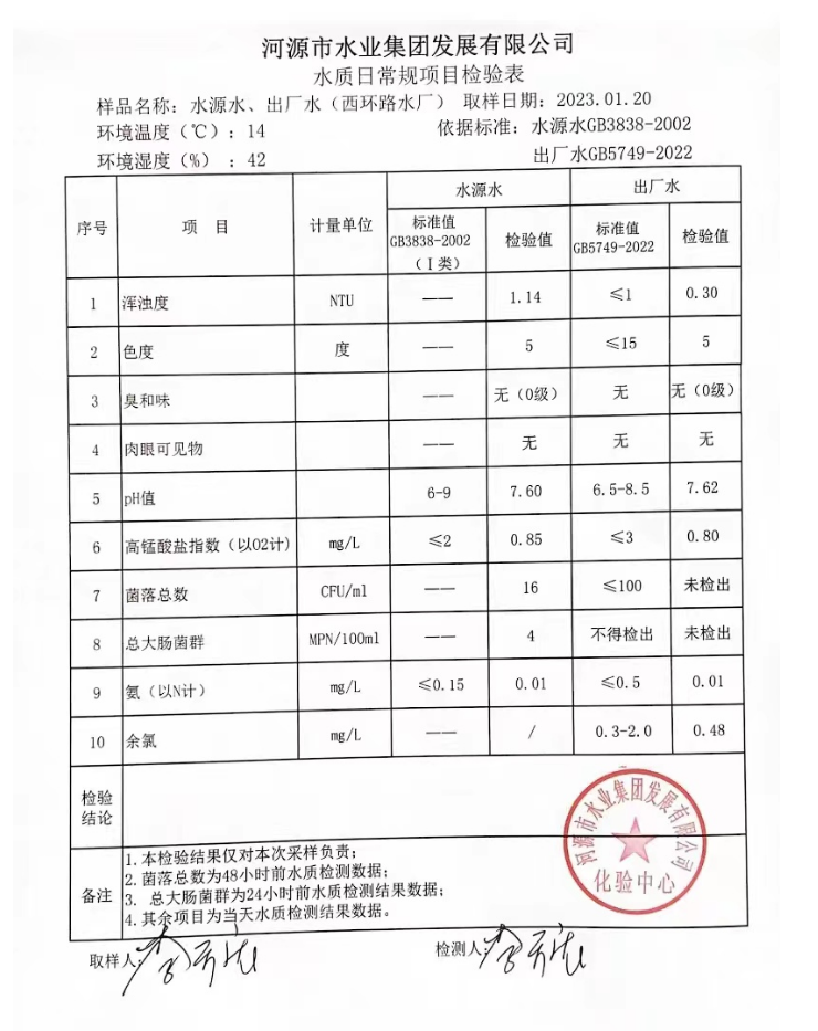 2023年1月20日水質(zhì)檢驗(yàn)報(bào)告