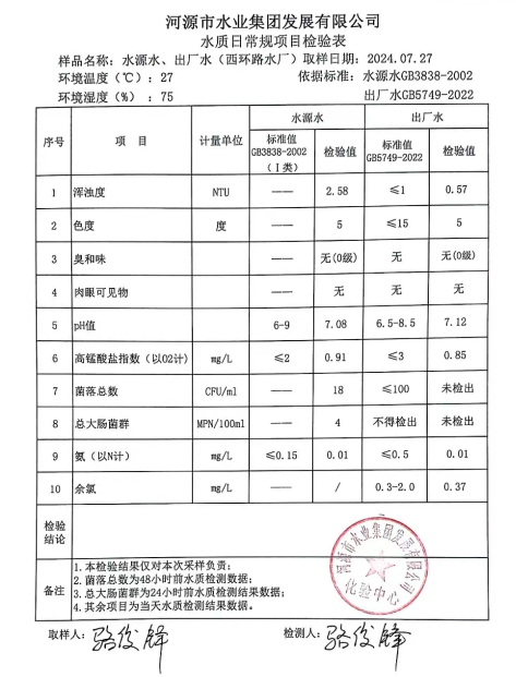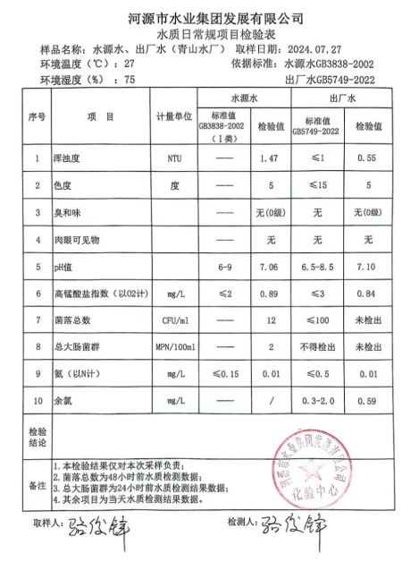2024年7月27日水質(zhì)檢驗(yàn)報告
