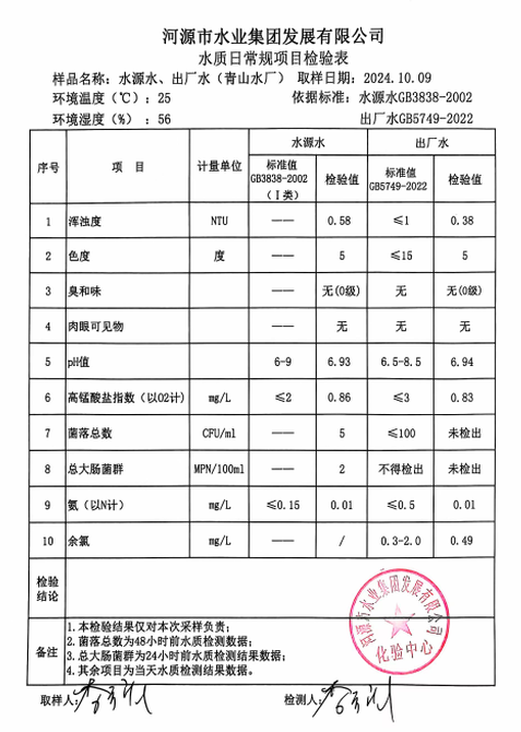 2024年10月9日水質(zhì)檢驗(yàn)報(bào)告
